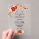 Elégante mariage acrylique en terre cuite orangée florale de automne Invitations. Faites une impression durable avec ces élégantes invitations en acrylique mariage de automne, avec de superbes fleurs orange et en terre cuite. Les tons d'automne riches et le design acrylique moderne créent une invitation sophistiquée et intemporelle, parfaite pour donner le ton de votre journée spéciale. Un choix unique et élégant pour une fête mariage de automne !
