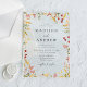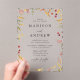 Élégantes invitations de mariage Fleur sauvage d'été avec vos noms et détails mariages en lettres noires classiques, encadrées par un beau tableau de fleurs d'aquarelle et de verdure dans les tons jaune doré, rose et violet. Conçues contre un arrière - plan acrylique élégant, ces fleurs sauvages d'aquarelle sont le choix idéal pour les mariages du printemps et de l'été. Personnalisez vos invitations de mariage pour refléter votre histoire d'amour unique avec ce design dynamique et d'inspiration nature.
