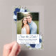 Ces belles cartes acryliques sont une façon spéciale et unique de faire connaître à vos amis et votre famille pour enregistrer la date pour votre prochain mariage. Le design boho chic rustique présente votre photo entourée de roses d'aquarelle peints à la main dans des tons bleu poussiéreux, marine et indigo, ainsi que des sprigs verts sauge d'eucalyptus et de verdure du jardin. Il y a de la place ci-dessous pour vos noms, la date et l'emplacement du mariage. Une belle façon de commencer votre voyage mariage.