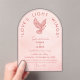 Cette faire-part de mariage en arc de cercle élégante et moderne présente un mélange romantique de raffinement et de charme, inspiré de l'intemporelle romance shakespearienne. L'avant présente un étonnant arrière - plan d'aquarelle dans les tons roses doux, ajoutant texture et profondeur à la conception. Au sommet se trouve la citation "Les ailes lumineuses de l’amour" de Roméo et Juliette, élégamment voûtée pour compléter la forme de l’invitation. En dessous de la citation, une illustration de colombe magnifiquement détaillée symbolise l'amour et l'unité, en s'attachant parfaitement au thème romantique. Les noms du couple, "James + Anna", sont présentés dans une typographie audacieuse et minimaliste, créant un point focal à la fois frappant et équilibré. Les détails de l’événement, y compris la date, l’heure, l’emplacement et l’information de réception, sont présentés dans une police sans serif propre et lisible, tout en maintenant l’esthétique moderne et minimale du design. Une fine bordure aux accents cardiaques délicats encadre l'invitation, ajoutant une touche de charme et liant les éléments ensemble.
