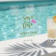 Funky enregistrez la carte de date en blanc avec des pops de couleur rose, tropical et vert poire avec votre date mariage et une fleur d'hibiscus peinte à la main et des bandes vertes dessinées à la main funky.