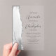 Le bord gauche de cette élégante faire-part de mariage moderne est orné d'une bordure en aquarelle grise et blanche ornée d'une parties scintillant en faux argent. Le texte personnalisable combine des polices de script et sans serif en gris fusain sur un arrière - plan transparent clair.