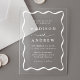 Voici notre faire-part de mariage acrylique moderne blanc Wavy Frame, où boho rencontre rétro dans une célébration harmonieuse de l'amour! Avec des lettres blanches dansant à travers l'arrière - plan acrylique transparent, orné d'un cadre ondulé rappelant le charme vintage, ce design fantaisiste donne le ton parfait pour votre journée spéciale. Personnalisé avec les noms du couple et les détails mariages, chaque élément dégage un air de nostalgie et d'élégance moderne. Offrez à vos invités l'enchantement de votre union avec cette invitation unique, invitant à se joindre à la joie de votre histoire d'amour boho-rétro.