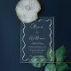 Faire-part de mariage acrylique simple et chic avec une bordure blanche ondulée, les noms de la mariée et du marié dans un script de calligraphie blanche et les détails de votre mariage dans le lettrage blanc moderne. Ajustez la taille de la police de script dans l'outil de conception pour des noms plus longs ou plus courts si vous le souhaitez.