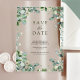 Éblouissez vos invités avec cet élégant enregistrer la date avec de beaux feuilles d'eucalyptus et la typographie moderne. Ajoutez simplement les détails de votre événement sur ce modèle facile à utiliser pour en faire une carte unique de sauvegarde de la date.
