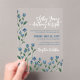Belle faire-part de mariage acrylique florale bleue avec illustrations de jolis fleurs sauvages bleus et vos noms dans un charmant script de brosse blanche contre un arrière - plan acrylique transparent pour un look mariage floral unique. Faire-part de mariage florale en bleu et blanc contre acrylique avec un beau look de printemps ou d'été pour votre mariage avec de minuscules fleurs bleues.