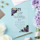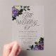 Cartes d'invitation de mariage floral élégant et morose avec des bouquets de fleurs violettes et ivoires, un feuillage vert luxuriant et des baies sombres aux coins sur un fond en acrylique givré ou transparent. "Le Mariage De" est affiché dans une typographie élégante et moderne. Personnalisez l'invitation de mariage florale violette avec vos noms et les détails du mariage. Le design est coordonné avec notre collection de mariage Floral Gothique Morose.
