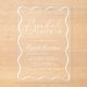 Invitation de mariage moderne en acrylique clair avec un cadre ondulé blanc tendance, "Mariage !" dans un script blanc chic et une typographie serif blanche classique, le nom de la mariée dans un script blanc élégant et les détails de la fête dans une écriture blanche simple.