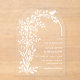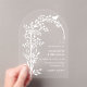 Créez une première impression époustouflante avec ces invitations de mariage acryliques modernes, présentant un oiseau blanc perché sur une branche botanique gracieuse. Le design acrylique voûté est à la fois unique et élégant, parfait pour les couples contemporains à la recherche d'un style minimaliste mais sophistiqué. Mis en évidence par un texte propre et personnalisable, ces invitations donnent le ton pour une journée de mariage mémorable. Le matériau transparent et le design intemporel font de ces invitations un beau souvenir pour vos invités.