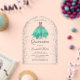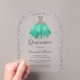 Invitation vos invités de quinceañera dans le style avec cette élégante invitation de fête avec une belle robe brillante argent et aqua turquoise et vos détails de fête en typographie grise script de calligraphie pour vous de personnaliser bordé de la parties scintillant faux argent sur un voir à travers l'arrière - plan acrylique. Conçu par Susan Coffey.