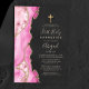 Le bord gauche de cette élégante invitation à la première communion moderne comporte une bordure en aquarelle rose ornée d'une parties scintillant en faux or. Une fausse croix de feuille d'or apparaît au-dessus du texte personnalisable, qui combine écriture manuscrite de couleur or pâle, copperplate et polices italiques sur un arrière - plan clair.