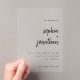 Ces invitations de mariage élégantes et minimalistes en acrylique clair sont caractérisées par une typographie de script noir et moderne et un texte sans serif propre pour un design simple et élégant que vous aimerez.