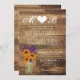Modèle en bois de faire-part de mariage de grange rustique de pays avec les fleurs et les tournesols pourpres foncés dans un pot de maçon avec les initiales des jeunes mariés avec un coeur au dessus. Ces invitations uniques de mariage campagnard sont parfaites pour n'importe quel mariage orienté rustique. Les initiales et le coeur du couple sont également sur le dos de l'invitation sur l'arrière - plan en bois rustique de conception.