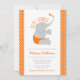 Une invitation orange et grise moderne de baby shower d'éléphant. Le motif de point rose et blanc doux de polka encadre les bords. Un éléphant mignon de bébé utilisant une couche-culotte orange avec les coeurs minuscules. Perfectionnez pour une partie de baby shower de garçon.