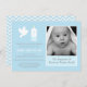 Une invitation bleue en pastel moderne, élégante et minimaliste de baptême ou de baptême en l'honneur du bébé. Éléments principaux de baptême de caractéristiques de conception comme la colombe, la bougie avec une croix et un espace pour la personnalisation de photo du peu une. Sur l'inverse la page est un motif de zigzag bleu et blanc en pastel de chevron. Personnalisez facilement avec des détails d'événement.