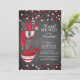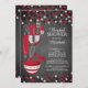 Le stock moderne l'invitation nuptiale de douche de cuisine comportant une goupille, bol mélangeur, spatule, coupeur de pizza, battent, l'éplucheuse végétale et les doseurs réglés sur un arrière - plan contemporain de tableau avec les confettis rouges et noirs de point de polka. Visitez notre magasin pour regarder cette invitation dans une série d'invitations populaires de wedding shower.
