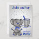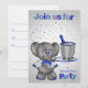 Invitation vos invités à une fête de bienvenue pour toute personne en général avec une carte montrant un mignon éléphant portant des lunettes de vue sur une jolie veste munie d'une cravate d'arc portant un plateau avec son coffre. La bouteille de champagne est réfrigérée dans un seau glacé élégant contre un arrière - plan dégradé avec des étoiles argentées et du texte. Conception par Laurie Schneider/Elements par La galerie de Jackie/Diana'z Creationz
