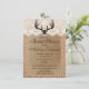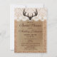 La toile de jute et la dentelle rustiques d'andouillers de cerfs communs impriment des invitations de Fête de la mariée de pays pour une jeune mariée de pays avec un mariage de thème de chasse. Ajoutez juste vos propres mots nuptiales de douche. L'arrière a également l'arrière - plan rustique d'impression de toile de jute. C'est une conception imprimée, tissu non réel de toile de jute.