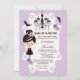 Les invitations wedding showers victoriens, violets, lavande et noirs sont parfaits pour une fête d'Halloween ou une douche à thème pour les couples. Vos invités seront ravis de recevoir ces invitations gothiques wedding showers super mignonnes avec un élégant lustre noir et violet et une mignonne goth fille avec rouge à lèvres noir et l'ombre de lavande, coeur tatoué noir sur son visage portant un anneau fiançailles améthyste dans une robe mariage gothique avec un dessus de corset violet. Les chauves-souris, peut-être l'une de ses vraies amoureuses et mariées de vampires, flottent au-dessus de sa tête. Verre de champagne à la main pour célébrer. Roses et fleuris apportent une touche victorienne à l'oeuvre. Un motif à fleurs à l'arrière. Oeuvre © Chrissy H. Studios, LLC. Tous droits réservés.