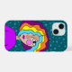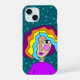 Buntes, helles, abstraktes Design eines stilisierten Mädchens mit gestreiftem Haar, mit einem Hintergrund von Sternen.