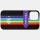 Dieses personalisierte Case-Mate Gehäuse für das iPhone 12 Pro weist in der Mitte ein in Regenbogenfarbenes vertikales Streifen-Muster auf, mit einem violetten lila Bannerband, das horizontal unter der Kamera verläuft und eine weiße Naht und eine weiße Schrift aufweist, die Sie mit Ihrem Namen oder anderen Texten anpassen können. Es gibt auch ein 3-Buchstaben-Monogramm, zentriert am unteren Rand in Weiß. Der schwarze Hintergrund kann in jede gewollt Farbe geändert werden. Sie werden stolz darauf sein, dieses moderne und trendige neue Hotel zu präsentieren, das eine schicke Aussage macht! Wenn Sie Hilfe benötigen, senden Sie eine E-Mail an niteowlstudio@gmail.com.