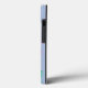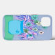 iPhone 13 coque avec un pot de fleurs bleu dessiné à la main, avec des feuilles roses et violets, et des fleurs de couleur mixte. L'arrière - plan est bleu et le couvert de table vert. Vous pouvez ajouter votre nom au pot, ou dans le coin supérieur droit.