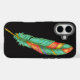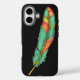 IPhone 16 Gehäuse mit farbenfroher grüner und orangefarbener Feder.