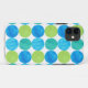Ein lebendiges Gehäuse zum Schutz Ihres iPhone 5, mit einem abstrakten "Blue Moons"-Muster in heller Blues und Neon Green auf weißem Hintergrund; von Judy Adamson aus einer handbemalten Papierkollektion.