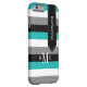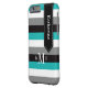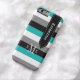 Dieses personalisierte Schwarze, weiße, Türkisblau und Grau Case-Mate kundenspezifische iPhone 6 Kasten hat ein breites mutiges gestreiftes Hintergrundmuster und ein schwarzes Fahnenband mit dem weißen Nähen diesem können Sie Ihren Namen, Initialen, Monogramm oder anderen Text hinzufügen. Dieser moderne und trendy neue Fall gibt eine Chicerklärung für den angesagten jungen Fashionista ab! Wenn Sie Unterstützung benötigen, emailen Sie niteowlstudio@gmail.com.