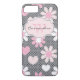 Dieser personalisierte rosa, weiße und graue Case-Mate kundenspezifische iPhone 7 Kasten hat die rosa und weißen Herzen und die Gänseblümchen-Blumen auf einem grauen Hintergrund mit einem Schwarzpolka-Punktmuster! fügen Sie Ihren Namen, Initialen, Monogramm oder anderer Text diesem modernen und modischen neuen Fall und Show jeder hinzu, ein welcher schicker Fashionista Sie sind! Wenn Sie Unterstützung benötigen, emailen Sie niteowlstudio@gmail.com.