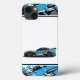 Diese iPhone-Hülle wird in weißer Farbe mit einem Auto-Rennwagen-Kunstdruck gezeigt. Passen Sie dieses Objekt an oder kaufen Sie, wie es ist. Börsenbild vecteezy.com
