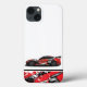 Diese iPhone-Hülle wird in weißer Farbe mit einem Auto-Rennwagen-Kunstdruck gezeigt. Passen Sie dieses Objekt an oder kaufen Sie, wie es ist. Börsenbild vecteezy.com