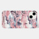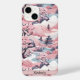 Das iPhone-Gehäuse in rosa und grauem japanischem Landschaftsbild mit ruhigen Pagoden und rosafarbenen Kirschblüten liegt an einem sanften Fluss, der durch die Berge fließt. Ideal für Ihre internationale Reise!