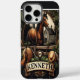 Un cheval se trouve devant une grange rustique, entourée de verdure et de blé. Un panneau en bois patiné portant le nom de Kenneth est accroché ci-dessous, montrant une scène agricole rurale.