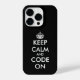 Restez calme et code sur l'iPhone 14 pro Coque personnalisé. Faites votre propre personnalisation garder calme mème citation. Couleur arrière - plan noire ou personnalisée. Amusant design modèle avec typographie et couronne modernes.