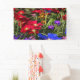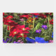 Ein Aufruhr aus bunten Frühlingsblumen in leuchtend rot, blau, lila, rosa und orange. Der Fokus liegt auf einer grauen Blume im Vordergrund, die von einem Regenbogen voller Blüten umgeben ist.