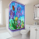 Meine ursprüngliche Wasserfarbmalerei druckte auf einem Duschvorhang, der lila Irisblüten und einen Monarchschmetterling am Sonnenaufgang-Set in einer Lavendelordnung kennzeichnet.