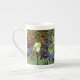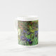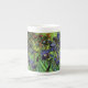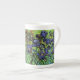 Des iris ont été peints en 1889 tandis que Vincent van Gogh habitait à l'asile au saint Paul-De-Mausole en Saint-Rémy-De-Provence, France, au cours de la dernière année avant sa mort en 1890. Un affichage renversant des iris violets avec le feuille vert vibrant, le sol riche de terre cuite, contre une toile de fond des soucis oranges lumineux et d'un iris blanc simple. Cette image a été numériquement augmentée pour reconstituer les couleurs audacieuses et lumineuses originales et les contours forts. Une tasse parfaite de porcelaine pour tout amant d'art !