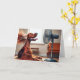 Ein fröhlicher irischer Setter-Hund sitzt vor einem Fan, sein Fell wird spielerisch von der Brise geblasen. Inside text kann geändert werden.