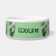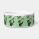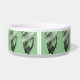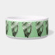 Eine Haustierschüssel mit einem irischen keltischen Thema, das einen Ring der glänzenden grünen Chromharfen um den Teller, mit einem Raum für den Ihren Namen des Haustieres kennzeichnet.