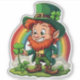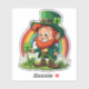 Dieses Design zeichnet sich durch ein niedliches Kobobold aus, das an einem vierblättrigen Kleeblatt, den er gefunden hat, mit einem schönen und farbenfrohen Regenbogen hinter ihm.