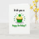 This greeting card features a digital illustration of a cupcake centered on a wide white background, giving the design lots of airy space. Across the top, the phrase “Irish you a Happy Birthday” appears in black text, and the remaining words continue along the bottom in emerald green, framing the cupcake like a friendly note passed between close friends 💚. The cupcake sits in a green wrapper with light stripes, and its soft yellow frosting curls upward in a generous swirl that feels sweet and inviting. A bright green shamrock rests on top, adding a cozy St. Patrick’s Day touch ☘️. Short green dashed lines radiate around the cupcake, like little sparks that draw your eye back to the center. Near the lower area, a small “Jossie” signature is tucked in discreetly without pulling focus. The green accents repeat in the wrapper, shamrock, and dashed rays, while the black-and-green lettering stays crisp against the white space.