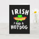 This card features a deep black background where the white phrase “IRISH I HAD A HOTDOG” sits centered in a rounded sans-serif style, grabbing your attention right away. The words are arranged in the middle so the joke reads clearly, with the illustration tucked in as part of the layout rather than off to the side. Beneath the text, a bright green shamrock ☘️ spreads out like a lucky base, and a hotdog rests over it as if it’s been set down with a fond, teasing grin. The frankfurter is a strong red, the bun is golden-brown, and the mustard runs in a neat yellow zigzag that feels like a little flourish shared between friends 💚. The contrast between the dark backdrop and the light lettering makes the colors stand out sharply without feeling busy. The shamrock’s green glow frames the snack like a small badge of St. Patrick’s Day fun, turning the pun into a cozy inside joke. The mustard line is drawn in a single wavy stripe across the top of the hotdog, bright yellow against the red and tan.