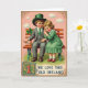This greeting card shows two rosy-cheeked children sitting close together on a rustic wooden bench, their faces turned toward each other with a tender, trusting look 💚. The boy wears a grey suit with an emerald tie and a matching green top hat, and his bright eyes make him seem quietly pleased. Beside him on the bench rests a small shamrock, a simple touch that draws your eye and adds a sweet Irish note ☘️. The girl leans in at his shoulder, her golden curls spilling over a verdant green dress with a white lace collar, and her calm expression matches his. Her tiny red Mary Jane shoes stand out against the green ground like two little dots of color. An ornate, worn-looking border frames the scene, while the background is pastel pink with soft, cloud-like shapes floating behind them. Along the bottom, a decorated numeral “1” comes before the phrase “WE LOVE THEE OLD IRELAND” in dark lettering beneath the illustration.