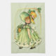 Niedliches irisches Mädchen oder Colleen mit hübschem Hut und Korb aus Kleeblättern auf pastellfarbenem Hintergrund. Dieses Vintage Design wurde sorgfältig von Hand restauriert.