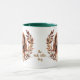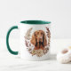 Ein hübscher Herbstkranz in den Farben Zimtbraun, Bräune und Creme umgeben das Aquarellbild eines schönen irischen Setter-Hundes. Das Bild wird zweimal auf der Tasse gedruckt, wobei der eigene Text dazwischen liegt.