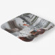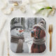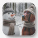 Ein Schneemann und ein irischer Setter-Hund in Hüten und Schals stehen in einem schneebedeckten Wald nebeneinander