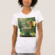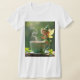 This whimsical and enchanting image features a tiny fairy dressed in green with delicate glowing wings, joyfully stirring a steaming cup of tea. Surrounded by soft green tones and subtle clover accents, the scene feels magical, cozy, and full of charm