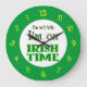 Diese lustige Wanduhr liest, dass ich nicht zu spät bin, ich bin in irischer Zeit, mit keltischen Knüpfarbeiten-Buchstaben in Gelb, rückwärts Zahlen auf grünem Hintergrund.