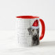 The mug has a design of a cute Irish Wolfhound dog wearing a Santa hat. The background of the mug is covered in a repeating pattern of the words "woof". The image is bright and cheerful, and it would be perfect for a Christmas-themed gift.